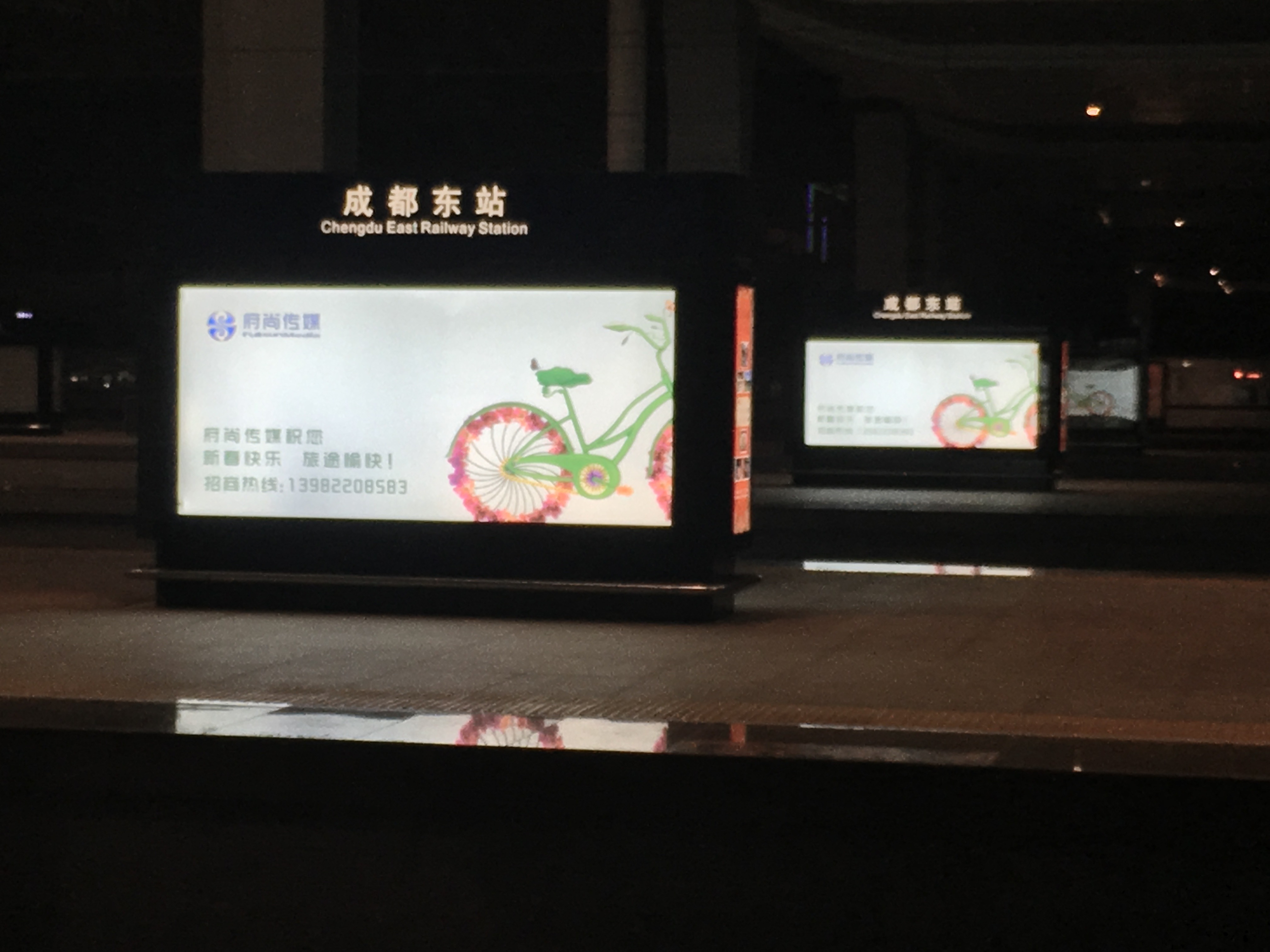 成都東站擁擠的各條站臺(tái)上,人群蜂擁上車下車,不經(jīng)意中會(huì)發(fā)現(xiàn),一體式全封閉多功能的廣告燈箱開(kāi)始啟用,LCD液晶屏、LED走字屏和滾動(dòng)燈箱畫面閃亮登場(chǎng)。這是府尚傳媒公司在我公司訂制的60套新型多媒體鋁型材燈箱,全部采用無(wú)線遠(yuǎn)程控制。